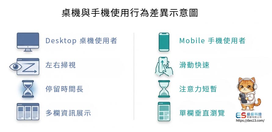 - 桌機使用者:停留時間較長、可同時閱讀多欄資訊、視覺空間充足。