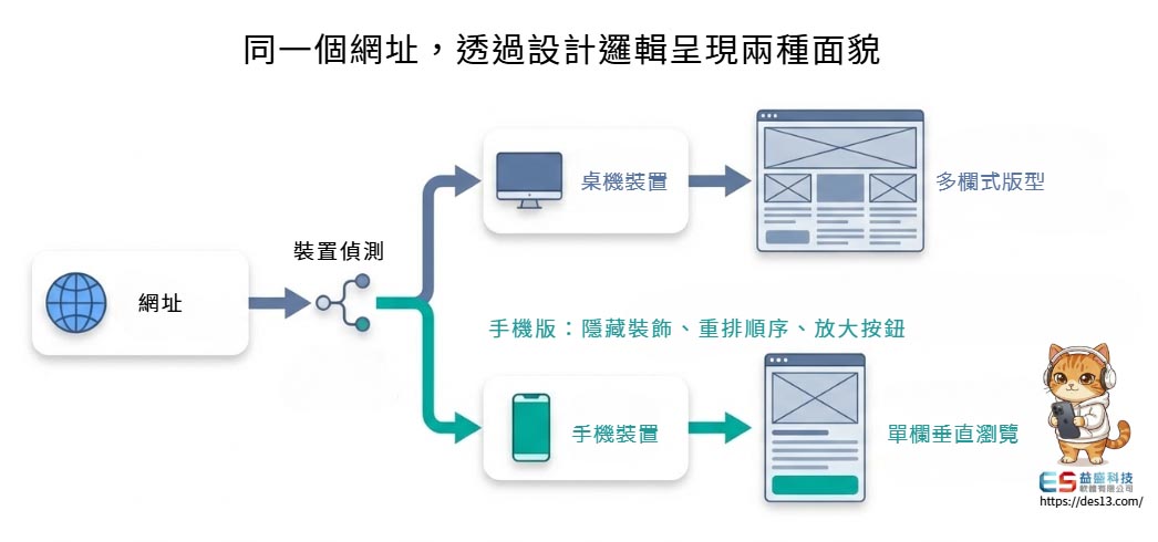 | 技術本質 | 單一 HTML,內容全數承襲桌機 | 同一 HTML,但針對裝置特化結構 |