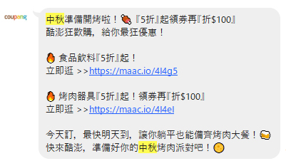 - 中秋主打「月餅+烤肉用品一站買齊」,食品與器具優惠 5 折起並加碼折價券,貼合節慶習俗
