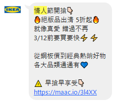 - LINE 官方帳號:在節日當天推送優惠祝福訊息(像是 3/8 婦女節一早送祝福)