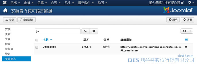 1. 到管理後台->擴充套件->語言管理->安裝語言->搜尋所需要的語言後進行安裝,我們以日文為例