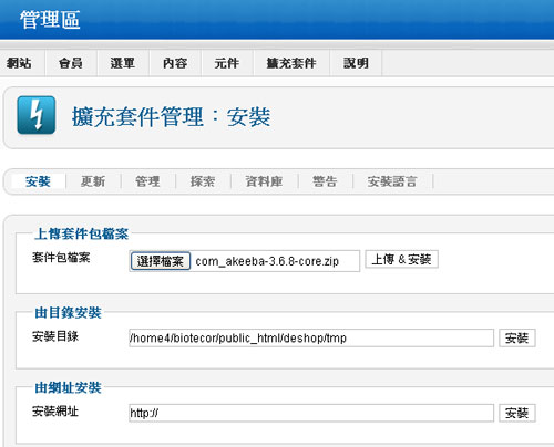 2.) 至joomla後台"擴充套件"-> "擴充套件管理" -> "上傳套件包檔案" -> "選擇檔案" -> "上傳&安裝"