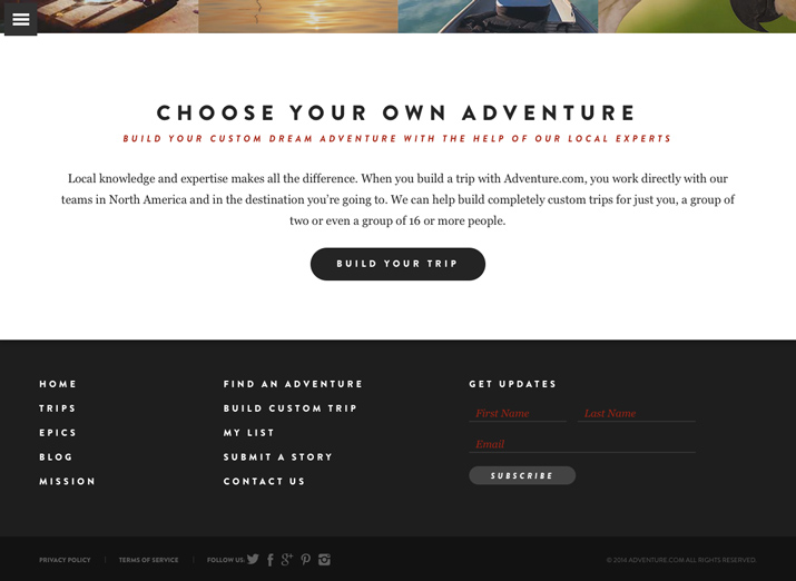 Adventure.com在螢幕正下方保留了一行版權聲明。這行資訊使用了低對比,這樣它就不會搶了更重要的資訊鏈結的風頭。