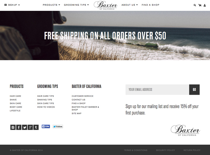 Baxter of California 擁有一個乾淨整潔並且包含大量鏈結的頁腳。多虧了這些沒有下劃線的簡單鏈結,這個頁腳看起來並不雜亂。