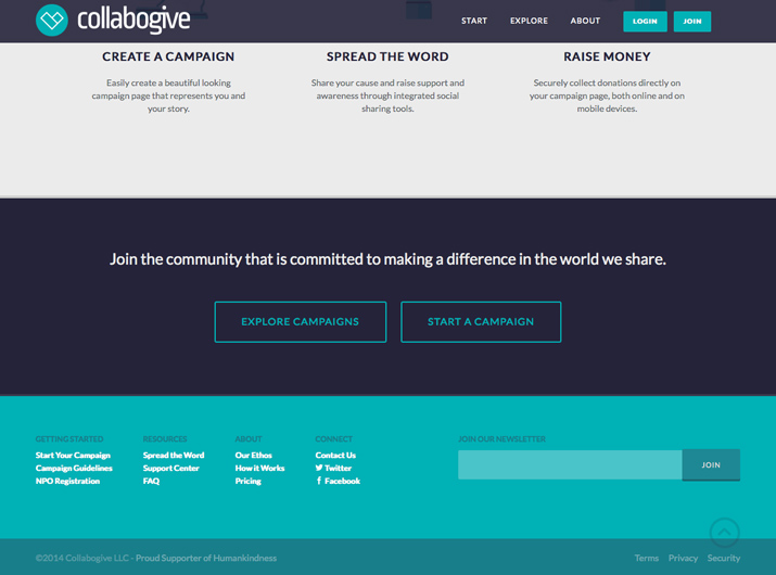 Collabogive 在頁腳區域添加了一個“訂閱我們的郵件”的標語。這個呼籲很容易看到,與網頁頁腳及版面設計融為一體,並且為用戶提供了一種無須加入組織就可以獲得其最新消息的方式。