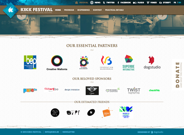 Kikk Festival在頁腳空間空使用logo和快速聯繫人資訊凸顯活動夥伴。注意圖示的大小——每個都易於看到,也易於閱讀。