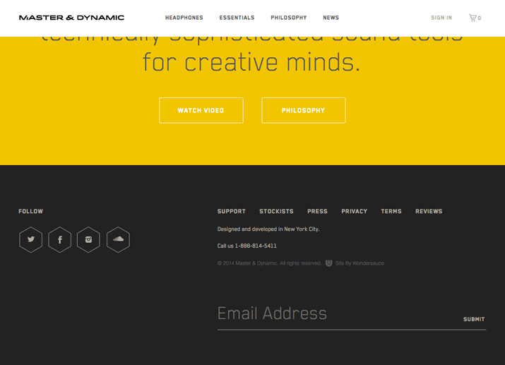 從 Master & Dynamic 的頁腳中你可以看到少即是多的網頁設計美學。簡單的圖示和文字可以讓你輕鬆流覽頁腳。