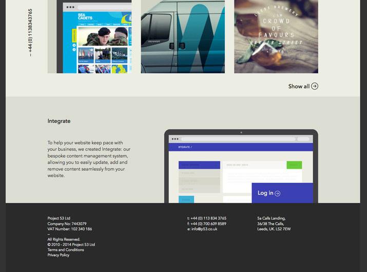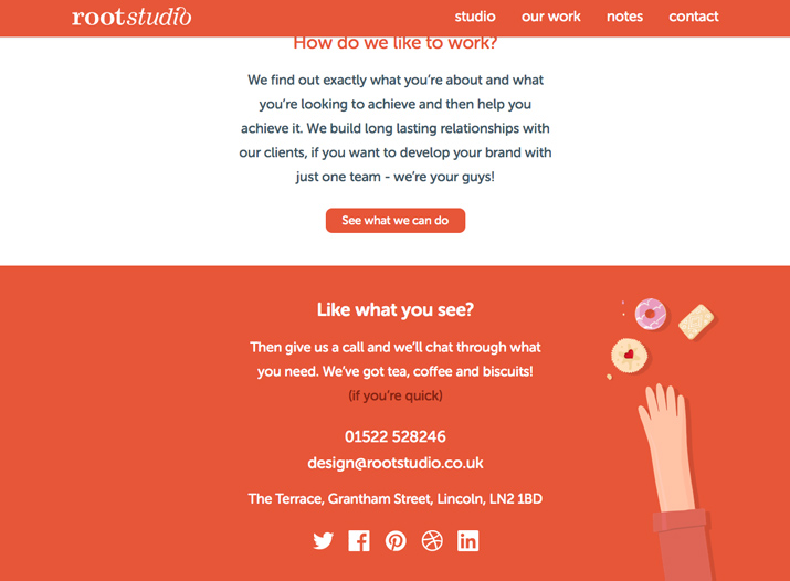 Root Studio做了一個幾乎違背你認為應該是“頁腳”的一切的頁腳,不過它文字很大,而且被壓縮為一個非常簡單的聯絡人資訊列表。