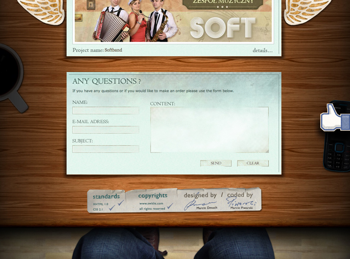 Swiths Interactive Group 的簡單頁腳與整個網站設計相得益彰,網站一個人坐在桌前,各種物品放在桌上。簡單的頁腳展示了相關資訊,而且看起來與網站融為一體。
